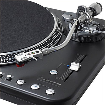 This superbly made, professional quality DJ turntable is designed primarily for use in clubs, touring and mobile DJ applications. It can also be used by music lovers to play their record collections at home. Its sleek, elegant matte-black and silver design fits into any stereo music or home entertainment system, and its built-in switchable phono pre-amp enables it to be used with a wide variety of receivers, powered speakers and other A/V components. As an added benefit, the turntable offers a USB output that allows direct connection to a computer for easy LP-to-digital conversion. Built to deliver exceptional music reproduction even under the most demanding conditions of professional use, The at-lp1240-usb xp utilizes a powerful direct-drive 16-pole, three-phase motor for quick startup, unwavering speed stability along with easy back-cueing, forward and reverse play and quiet operation at 33-1/3, 45 or 78 RPM. The turntable features an S-shaped tone arm with adjustable tracking force (counterweight) and anti-skate adjustment. It comes with the AT-HS1 universal 1/2"-mount head shell and the AT-XP5 DJ phono cartridge, which provides a unique combination of high-fidelity performance and precise tracking capability. Additional DJ-friendly features including a damped cast-aluminum platter with stroboscopic speed markings and slip mat, an illuminated speed indicator and adjustable pitch control, Dual start/stop buttons, a removable stylus target light, a dedicated tone arm grounding lug, a hydraulically damped lift lever and a locking tone arm rest that keeps the arm and cartridge in place during transport. Audacity and other compatible third-party software packages can be used to convert the audio on a record to MP3, WAV or other format digital audio files. Specs: type: 3-speed, fully manual operation motor: 16-pole, 3-phase, brushless DC motor driver method: direct drive speeds: 33-1/3 RPM, 45 rpm, 78 rpm turntable platter: 332 mm diameter die-cast aluminum starting torque: >4.5 kgf.Cm Braking system: Electronic brake wow and flutter: <0.1% WRMS (JIS WTD) with 33 rpm signal-to-noise ratio: >55 dB (DIN-B) output level: pre-amp ???phono???: 2.5 mV Nominal at 1 kHz, 5 cm/sec, pre-amp ???line???: 150 mV Nominal at 1 kHz, 5 cm/sec USB function: a/D, D/A ??“ 16-bit/44.1 kHz or 48 kHz USB selectable; computer interface ??“ USB 1.1 compliant Windows 7 or above, or Mac OS X or above power supply requirements: 120V AC, 60 Hz power consumption: 13W dimensions: 450.0 mm (17.72")W x 353.0 mm (13.90")D x 166.5 mm (6.56")H weight: 12.5 kg (27.6 lbs.), without dust cover accessories included: slip mat; dust cover, platter; 45 RPM Adapter; counterweight; AT-XP5 DJ phono cartridge; AT-HS1 head shell; power cord; USB cable; Dual RCA (Female) to 1/8" (3.5 mm) mini-plug (Male) Stereo Adapter cable; Dual RCA (Female) to 1/8" (3.5 mm) mini-plug (Female) stereo Adapter cable; Dual RCA (male) cable with integrated ground wire; stylus target light RIAA: Static balanced S-shaped tone arm with detachable head shell effective arm length: 230 mm Overhang: 15 mm height of tone arm adjustment range: 0-6 mm tracking Error angle: less than 3 degrees applicable cartridge weight: 13-18 G with head shell anti-skating range: 0-3 G replacement stylus: atn-xp5.