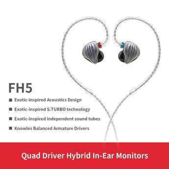 • ???Exotic-inspired S.TURBO technology for a burst of pure, raw lows??‘The FH5??™s low frequency sound tube adopts FiiO??™s patented S.TURBO (stands for Sound Turbo) acoustic structural design, which makes you get meaty, deep bass. S.TURBO also filters out unnecessary mid and high frequencies produced by the bass driver ensuring a more seamless transition between the lows and highs.