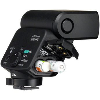 In addition to automatic control, the AF201FG has a dial on the back that enables the setting of manual power at 1/1 or 1/4. The flash also offers a recycle time of 4-7 seconds at full power and is compatible with first and second curtain sync modes. It runs on 2 AAA batteries and comes with a case.