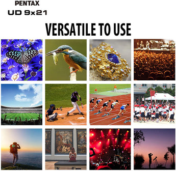 The atypical 9x21 configuration balances magnification with exit pupil to improve the viewing experience while boosting the viewing angle, so you won't have to move your head from side to side to see the scene in front of you. Its compact roof-prism light path produces thin optical tubes for easier handling, with a slip-resistant focus knob and diopter ring to bring your view into sharp and crisp focus. Anti-reflection multi-coatings maximize light transmission and reduce ghosting and flare, so your subjects will be bright and clear with improved resolution, and twist-up rubber eyecups ensure comfortable viewing with or without corrective eyewear or sunglasses. For your convenience, the UD binoculars come with a carrying case and a neck strap.