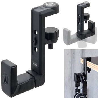 The AT-HPH300 Headphone Hanger from Audio-Technica is a convenient tool for safely storing your headphones in areas where space is limited. The hanger features an adjustable clamp that mounts securely to a shelf, desk, or other surface up to 1.4" thick.
