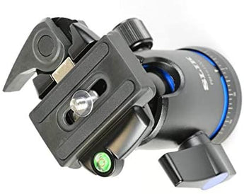 The SLIK PBH-535AS Ball Head with 6507 Quick Release Plate is an Arca-type ball head that has a load capacity of 11 lb and can be attached to tripods or other support systems that feature a 3/8"-16 mount. A reducer bushing is provided, which allows this ball head to be attached to tripods or other support systems that feature a 1/4"-20 mount. Cameras or accessories that are compatible with a 1/4"-20 mount can be connected to the included 6507 Quick Release Plate. The quick-release plate can be attached or removed from the Arca-Type clamp located at the top of the head's ball-and-socket joint by pulling the clamp's integrated cam lock lever, which also allows the plate to be reattached. The quick-release plate features a rubberized, non-slip platform while a built-in bubble level along the edge of the clamp accommodates landscape orientations. By loosening the ball head's primary locking knob, the head's ball-and-socket joint can be quickly swiveled, angled, fully tilted, or returned to its upright position. Variable tension can be applied to the ball-and-socket joint's movements by rotating the friction knob located on the opposite side of the primary locking knob. Between the primary locking knob and friction knob is a secondary locking knob, which controls the ability to rotate the head 360°.