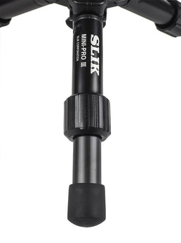 When retracted and closed, the SLIK MINI series tripods are about the size of standard telephoto lens, meaning they can be carried in your camera bag all the time so tripod support is always at hand! Besides its traditional use as a tripod, the SLIK MINI PRO III has another great feature, the ability to use the tripod as a "Chest-Pod" camera support. To use it as a chest-pod, first loosen the locking collar around the center column, pull out (raise) the center column at least one inch and tighten. Then, with the legs spread, place the feet of the legs against your upper chest. Loosen the tripod head and position the camera so you can see through the viewfinder comfortably. This will better stabilize the camera and help avoid image degrading camera shake.